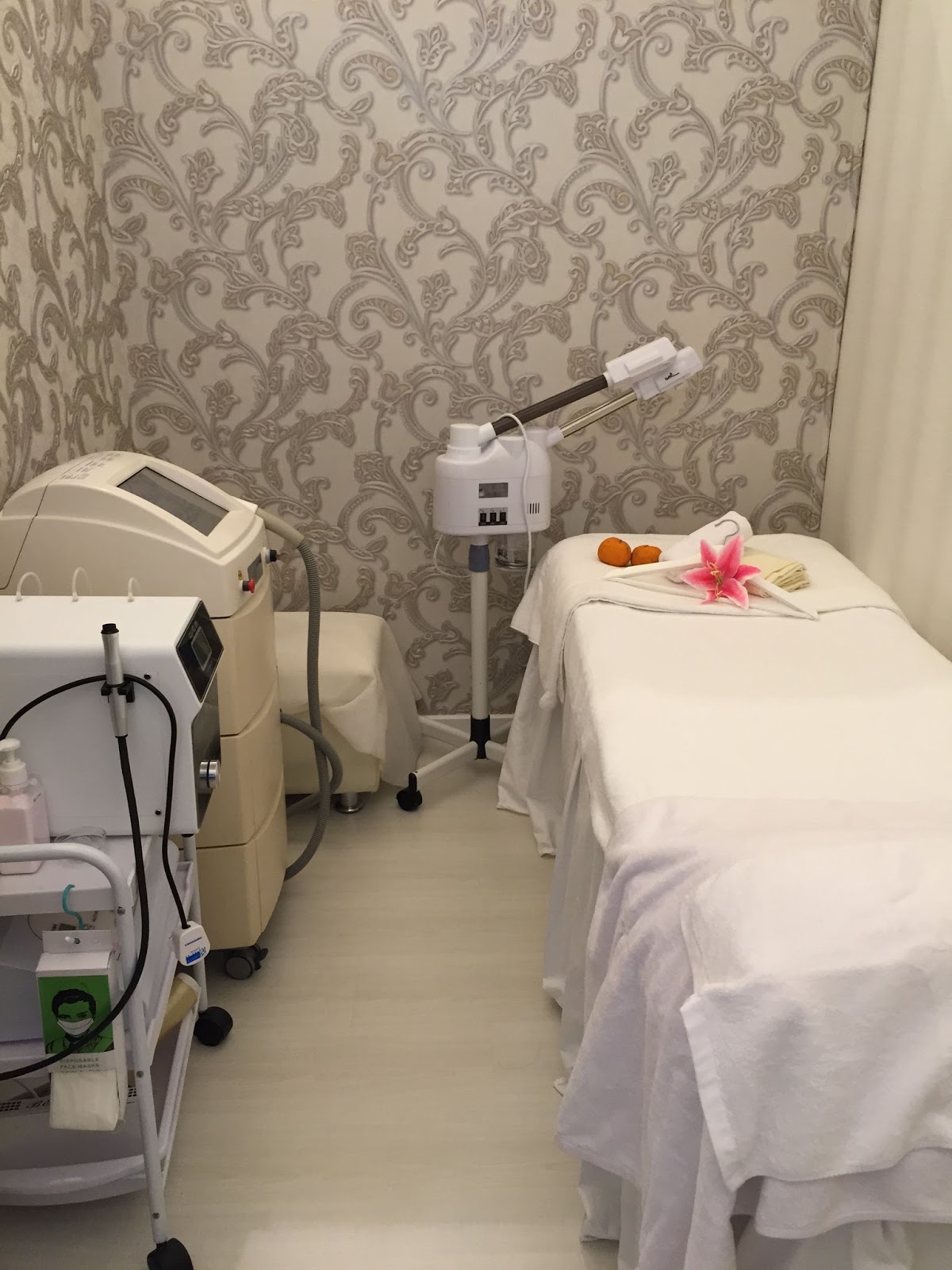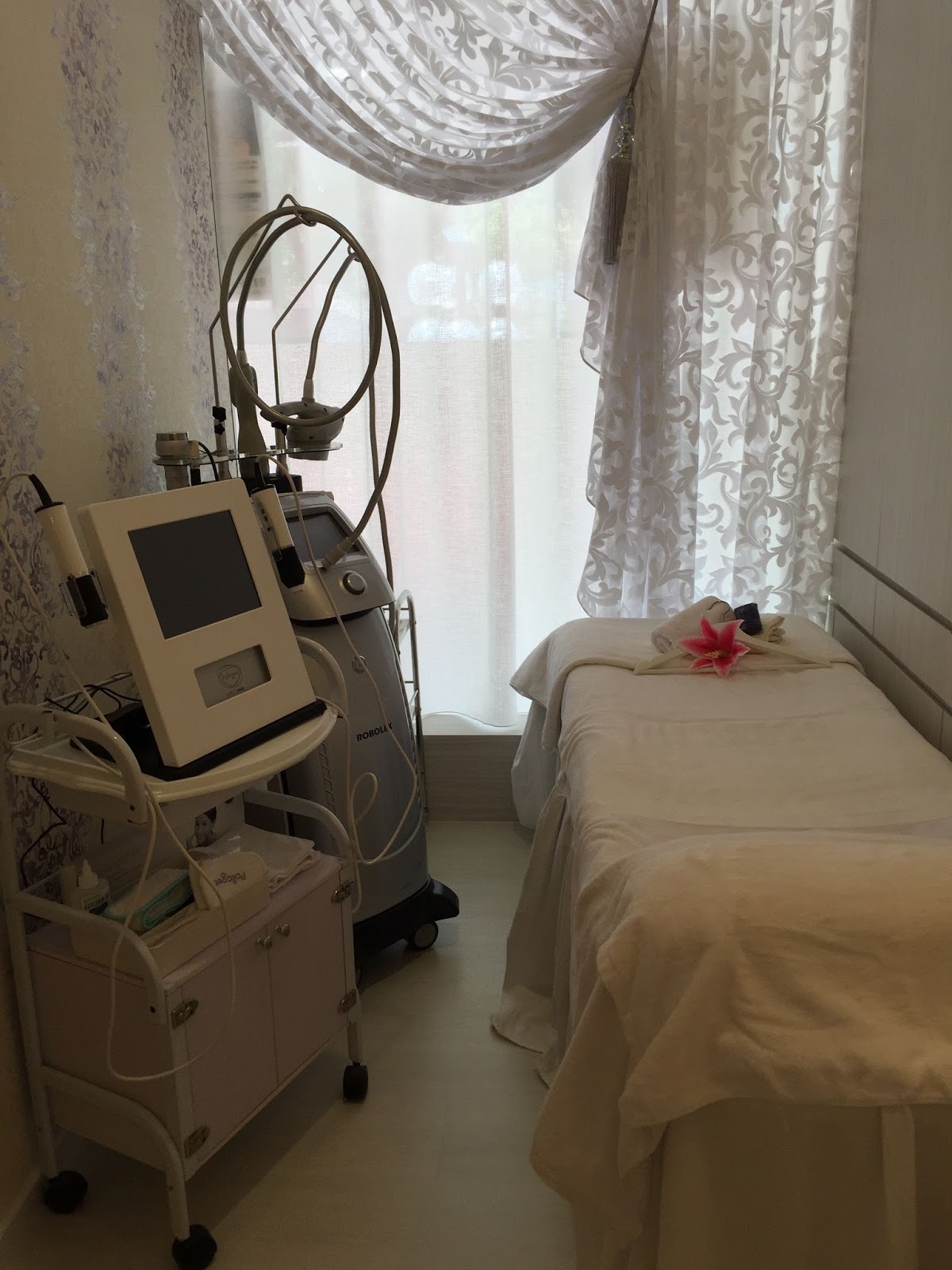 Let’s take a look at the treatment room. This room contained the slimming machine which would be used on me. I loved how the room was decorated with the feminine lacy curtains and flowery wall paper.